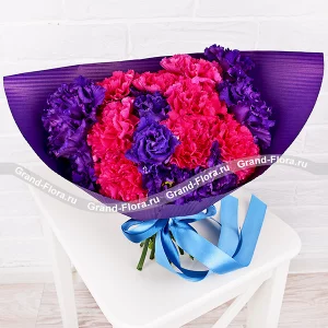 Альпийская заря - букет с розовыми гвоздиками и эустомой