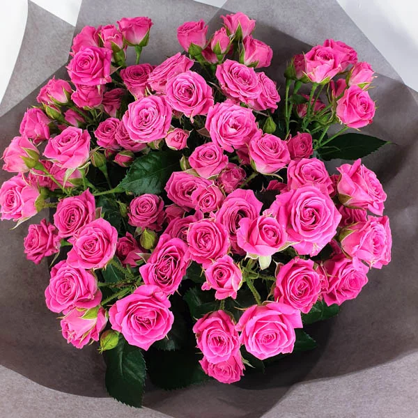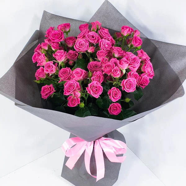 роза кустовая розовая - 25 шт, упаковка, лента розовая. Примерный размер: 45Х45 см.